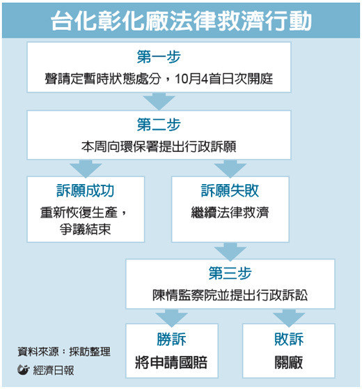 同一時間,台化展開行政訴願,正在整理100多天來與環保局往來文件,最快本周正式提出;若訴願敗訴,立刻啟動第三步驟,陳情監察院與行政訴訟。台化副董事長洪福源說,員工與公司都遭到莫大損害,「不惜一切代價也要討公道」。