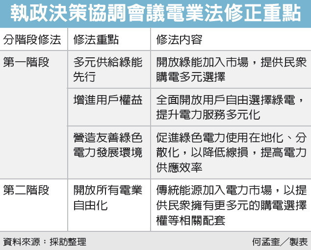 蔡英文總統昨(17)日主持執政決策協調會議,拍板電業法修正方向,將採漸進式的修法步驟,分兩階段進行。行政院會將於本周四通過這項草案,希望立法院在本會期完成修法。