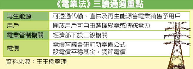 立法院昨天三讀《電業法》修正案,為鼓勵綠電發展,未來輸配電業應優先併網、調度再生能源,並享有輸配電優惠,業者亦可直接銷售予用戶;修法亦放寬綠電業者在一定裝置容量以下,不需提供備用供電容量,以降低民間投入之門檻。